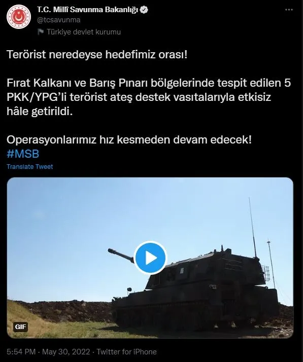 "Terörist neredeyse hedefimiz orası! Fırat Kalkanı ve Barış Pınarı bölgelerinde tespit edilen 5 PKK/YPG'li terörist ateş destek vasıtalarıyla etkisiz hâle getirildi. Operasyonlarımız hız kesmeden devam edecek!"