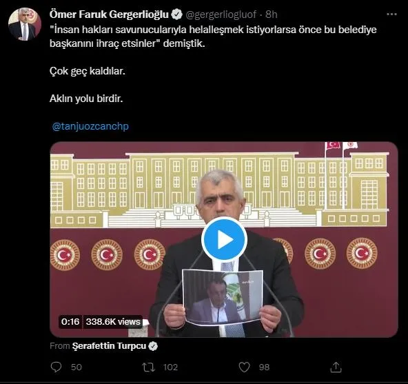 Kılıçdaroğlu'nun derin pazarlıklar nedeniyle partisiyle ilişiğini kesmek istediği Tanju Özcan haberinin ardından HDP kanadından ilk açıklama geldi. HDP Kocaeli Milletvekili Ömer Faruk Gergerlioğlu "İnsan hakları savunucularıyla helalleşmek istiyorlarsa önce bu belediye başkanını ihraç etsinler" demiştik. Çok geç kaldılar. Aklın yolu birdir." dedi.