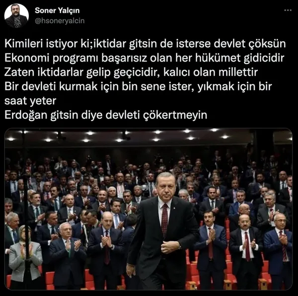 Erdoğan gitsin diye devleti çökertmeyin." ifadelerini kullandı.Yalçın yazısından bir bölümü de Twitter hesabında Başkan Recep Tayyip Erdoğan fotoğrafı ile paylaştı.