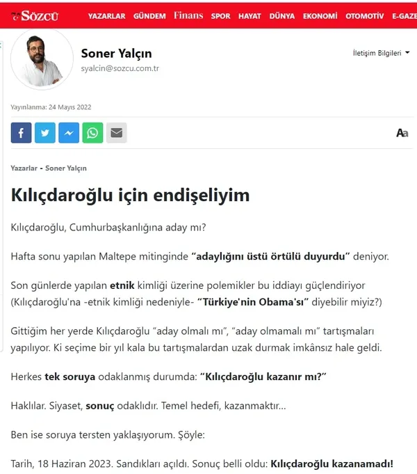 Sözcü yazarı Soner Yalçın, İmamoğlu'nun adaylık için ismi anılmaya başlandığı andan itibaren Kılıçdaroğlu aleyhinde yazılar yazmaya, Kılıçdaroğlu'nun kazanamayacağını söylemeye başlamıştı.