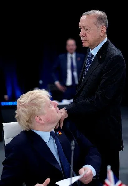 Başkan Erdoğan, masada oturan İngiltere Başbakanının omzuna dokunması üzerine, Johnson "Merhaba dostum" diyerek ayağa kalkıp selamlaştı.