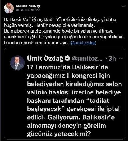 Özdağ'ın algısını çürüten Ersoy, "Balıkesir Valiliği açıkladı. Yöneticileriniz dilekçeyi daha bugün vermiş. Henüz cevap bile verilmemiş. Bu mübarek arefe gününde böyle bir yalan ve iftirayı, ancak senin gibi bir yalan propaganda uzmanı yapabilir ve bundan ancak sen utanmazsın." dedi.