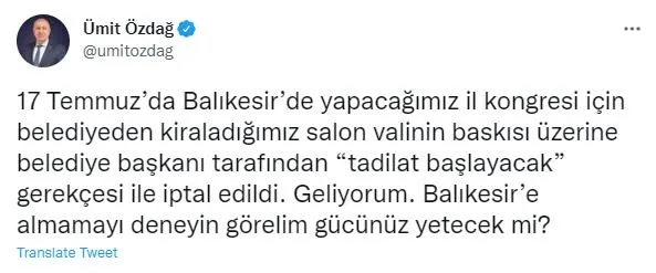 Özdağ, paylaşımında, "17 Temmuz'da Balıkesir'de yapacağımız il kongresi için belediyeden kiraladığımız salon valinin baskısı üzerine belediye başkanı tarafından "tadilat başlayacak" gerekçesi ile iptal edildi. Geliyorum. Balıkesir'e almamayı deneyin görelim gücünüz yetecek mi?" ifadelerini kullandı. Gerçek ise Balıkesir Valiliği ve İçişleri Bakanlığı yetkilileri tarafından yapılan açıklamalarla ortaya çıktı.