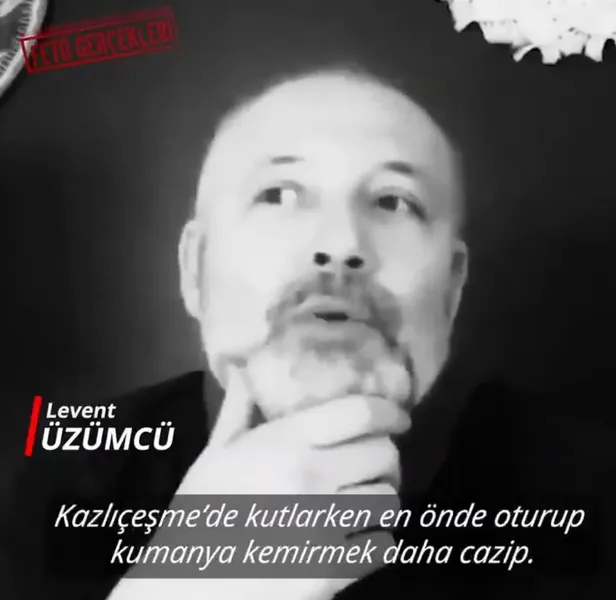 CHP'li Meclis Üyesi, Tiyatro Oyuncusu Levent Üzümcü... Üzümcü, FETÖ'nün büyükbaşı Hasan Ali Yurtsever'in yayınlarına katılmış ve 15 Temmuz anmasına katılan sanatçıları adeta şikayet etmişti.