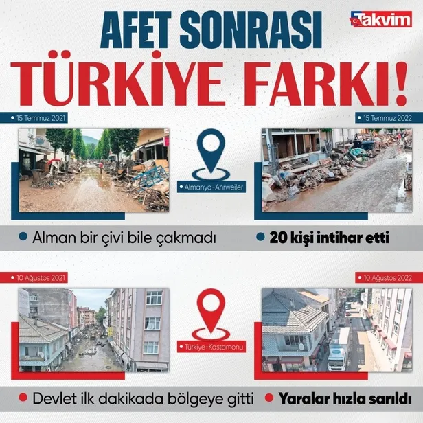 Türkiye sel felaketinin yaralarını üzerinden bir yıl bile geçmeden sararken, Batı Karadeniz'deki sellerden yaklaşık 1 ay önce 14-15 Temmuz 2021 tarihlerinde sel felaketi yaşayan Almanya, ortaya çıkan yıkım karşısında çaresiz kaldı. Almanya'nın Rheinland-Pfalz ve Kuzey Ren Vestfalya (KRV) eyaletlerinde meydana gelen ve 134 kişinin hayatını kaybettiği sel felaketinin yaraları halen sarılamadı. Almanya'da geçen yıl temmuz ayında aşırı yağışların neden olduğu sel ve su baskınlarında adeta felaket yaşandı.
