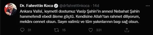Sosyal medyadan taziye mesajı yayınlayan Sağlık Bakanı Fahrettin Koca, "Ankara Valisi, kıymetli dostumuz Vasip Şahin'in annesi Nebahat Şahin hanımefendi ebedi âleme göçtü. Kendisine Allah'tan rahmet diliyorum, mekânı cennet olsun. Sayın valimiz ve tüm yakınlarının başı sağ olsun." ifadelerini kullandı.