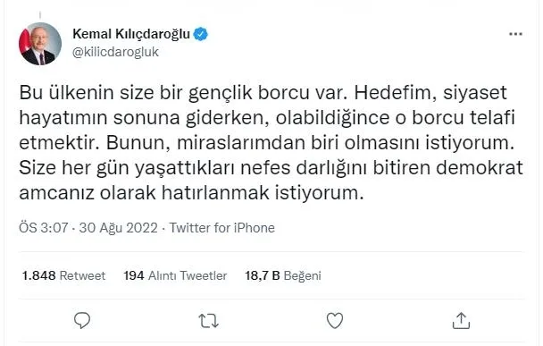 Tedirginliği tweetlerine yansıyan Kılıçdaroğlu, gençlere 'beni seçin' çağrısında bulunarak, "Bu ülkenin size bir gençlik borcu var. Hedefim, siyaset hayatımın sonuna giderken, olabildiğince o borcu telafi etmektir. Bunun, miraslarımdan biri olmasını istiyorum. Size her gün yaşattıkları nefes darlığını bitiren demokrat amcanız olarak hatırlanmak istiyorum" ifadelerini kullandı.