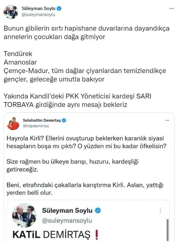 Bakan Soylu, Demirtaş'ın hadsiz sözlerine ilişkin yeni bir paylaşım yaparak, "Bunun gibilerin sırtı hapishane duvarlarına dayandıkça annelerin çocukları dağa gitmiyor Tendürek Amanoslar Çemçe-Madur, tüm dağlar çiyanlardan temizlendikçe gençler, geleceğe umutla bakıyor. Yakında Kandil'deki PKK Yöneticisi kardeşi SARI TORBAYA girdiğinde aynı mesajı bekleriz." dedi.