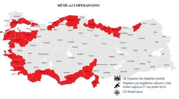 İçişleri Bakanlığı, Emniyet Genel Müdürlüğü Kaçakçılık ve Organize Suçlarla Mücadele (KOM) Daire Başkanlığı koordinasyonunda, organize suç örgütü üyesi oldukları gerekçesiyle gözaltı kararı verilen 233 şüphelinin yakalanması amacıyla 20 ilde "Müsilaj-2 Operasyonu"nun başlatıldığını bildirdi.
