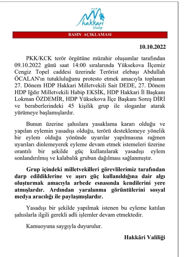 Hakkari'nin Yüksekova İlçesinde önceki gün, aralarında 27. Dönem HDP Hakkâri Milletvekili Sait Dede, 27. Dönem HDP Iğdır Milletvekili Habip Eksik, HDP Hakkâri İl Başkanı Lokman Özdemir, HDP Yüksekova İlçe Başkanı Soreş Diri'nin de bulunduğu 45 kişilik bir grup, Cengiz Topel Caddesi üzerinde toplanarak, terörist elebaşı Abdullah Öcalan'ın tutukluluğunu protesto etmek amacıyla sloganlar atarak yürümeye başladı.