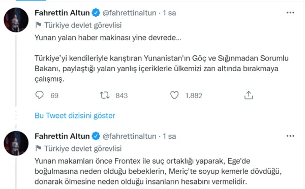 Altun, Yunanistan Göç ve İltica Bakanı Notis Mitarakis'in, Twitter'dan Türkiye'ye ilişkin yaptığı paylaşımlar üzerine, sosyal medya hesabından açıklamalarda bulundu.