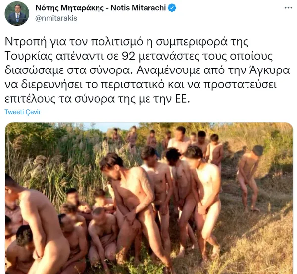 Yunan Göç ve İltica Bakanı Notis Mitarakis skandal bir paylaşıma imza attı. Mitarakis sosyal medya hesabında, Yunan güvenlik güçleri tarafından soyulup sınırda ölüme terk edilen göçmenlere ait bir fotoğraf paylaştı. Ancak Yunan Bakan, göçmenlere zulmeden tarafın Türkiye olduğunu öne sürdü.