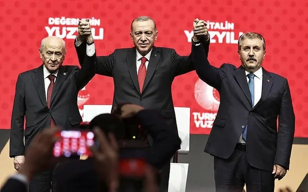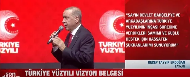 Erdoğan, "Milliyetçi Hareket Partisinin değerli Genel Başkanı Sayın Devlet Bahçeli'ye ve arkadaşlarına, bugün burada bir araya gelmemize vesile olan Türkiye Yüzyılı'nın inşası sürecine Cumhur İttifakı çatısı altında verdikleri samimi ve güçlü destek için hassaten şükranlarımı sunuyorum." dedi.