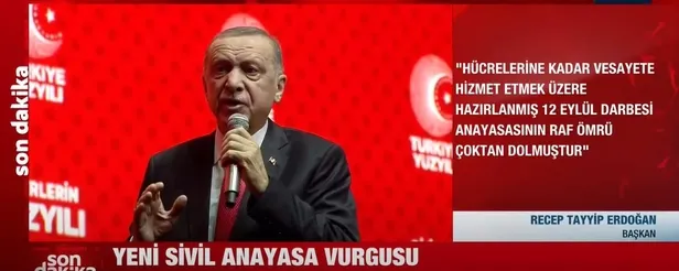 "Hücrelerine kadar vesayete hizmet etmek üzere hazırlanmış 12 Eylül darbesi anayasasının raf ömrü çoktan dolmuştur. Bu doğrultuda başlattığımız girişimlerin bazıları Meclis safhasında, bazıları daha teklif aşamasında, muhalefetin destek vermemesi sebebiyle akim kalmıştır. Her şeyiyle milli iradenin ürünü yeni bir anayasayı ülkemize kazandırmak, Türkiye Yüzyılı vizyonumuzun ilk hedeflerinden biridir. Bu yeni anayasayı, ülkemizin huzurunu güçlendirecek, milletimizin refahını yükseltecek, hukukun üstünlüğünü, çoğulculuğu, adaleti, hakkaniyeti tahkim edecek, her bir vatandaşımızın özgürlüklerini garanti altına alacak, gençlerimizin geleceklerine umutla bakmalarını sağlayacak, özetle Türkiye Yüzyılı'na yakışacak şekilde hazırlayarak, Meclisimizin takdiri ve milletimizin onayıyla hayata geçirmekte kararlıyız."