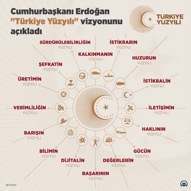 Son dakika haberi! Başkan ve AK Parti Genel Başkanı Recep Tayyip Erdoğan, ülkenin ikinci yüzyılına dair yeni program ve hedeflerin yer aldığı "Türkiye Yüzyılı" Tanıtım Toplantısı'nda vizyon belgesini açıkladı. Türkiye üzerinde kirli emelleri olan emperyalistlerin varlığına dikkat çeken Başkan Erdoğan, "Emperyalistlerin ülkemiz üzerindeki hesapları hiç eksik olmadı. Bu kirli hesaplarda kullanılan maşalar da hiç eksik olmadı." dedi. 12 Eylül Anayasası'nın raf ömrünü doldurduğunu ve başörtüsü için anayasa teklifinin önümüzdeki hafta Meclis'e geleceğini belirten Başkan Erdoğan, "12 Eylül Anayasası'nın raf ömrü çoktan dolmuştur. Yeni bir anayasayı ülkemize kazandırmak Türkiye Yüzyılı vizyonunun ilk hedefidir." ifadelerini kullandı. Türkiye'nin kritik bir aşamada olduğunu sözlerine ekleyen Erdoğan, "Öyle kritik bir eşikteyiz ki, bundan sonra atacağımız adımlarla, ya bu ligin ön sıralarındaki yerimizi alacağız, ya da tekrar geriye düşme riskiyle karşı karşıya kalacağız." şeklinde konuştu. Kanal İstanbul'un hedefleri arasında olduğunu açıklayan Erdoğan, "Çalışmalar yakında başlayacak." dedi. Erdoğan konuşmasının son bölümünde, "Ülkemizin gündemine yakışan yeni 'Kızılelma'sı, ancak Türkiye Yüzyılı olabilir." dedi.