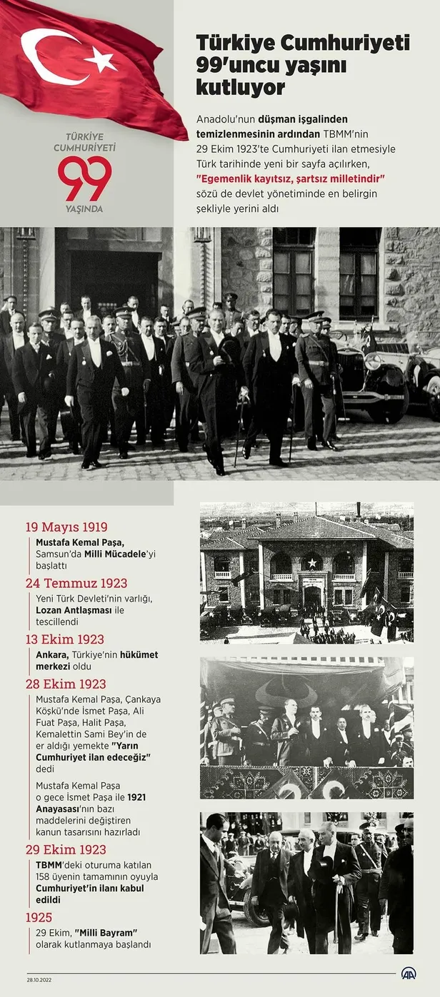 Bugün, Cumhuriyet'in 99'uncu yıldönümü. Anadolu'nun düşman işgalinden kurtarılmasının ardından 29 Ekim 1923'te Mustafa Kemal Atatürk tarafından hazırlanan "Türkiye devletinin hükümet şekli cumhuriyettir" hükmünün yer aldığı tasarının, TBMM'de 158 üyenin tamamının oyuyla kabul edilmesiyle Cumhuriyet ilan edildi. Türk tarihinde yeni sayfa açılırken, "Egemenlik kayıtsız, şartsız milletindir" sözü de devlet yönetiminde en belirgin şekliyle yerini aldı.