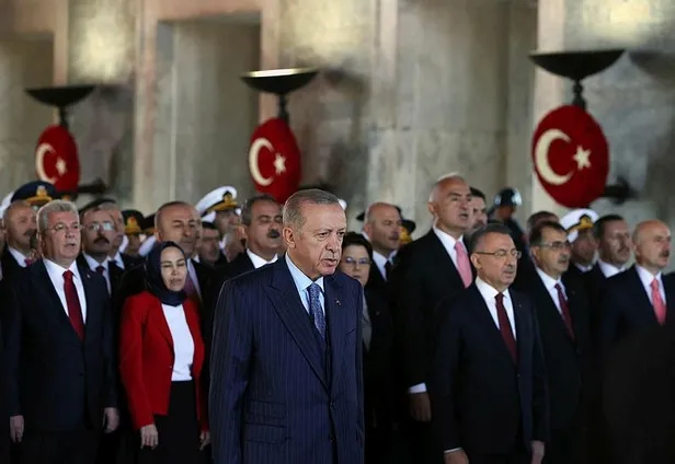 Başkan Erdoğan'ın üzerinde ay yıldız bulunan çelengi Atatürk'ün mozolesine bırakmasının ardından saygı duruşunda bulunuldu ve İstiklal Marşı okundu.