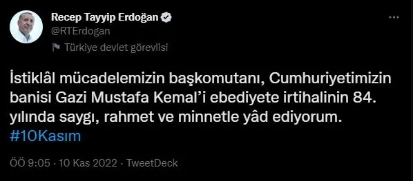 Erdoğan, sosyal medya hesabından Atatürk'ün ebediyete intikal ettiği saat olan 09.05'te yaptığı paylaşımda, "İstiklal mücadelemizin Başkomutanı, Cumhuriyetimizin Banisi Gazi Mustafa Kemal'i ebediyete irtihalinin 84. yılında saygı, rahmet ve minnetle yad ediyorum." ifadelerini kullandı.