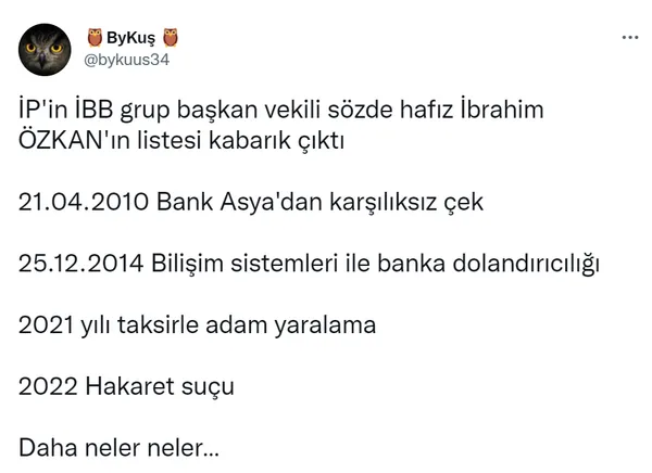 İYİ Partili Özkan'ın bir suç makinası olduğu ortaya çıktı. İBB'de İYİ Parti Grup Başkanvekili olan Özkan'ın 2021/546 esas numaralı Taksirle Bir Kişinin Yaralanmasına Neden Olma ve 2022/385 esas numaralı Hakaret suçundan UYAP açık dosya kaydının olduğu,