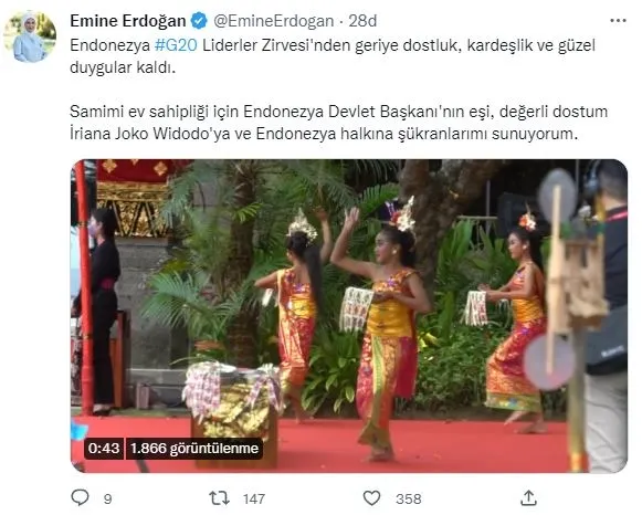 Emine Erdoğan, sosyal medya hesabından yaptığı paylaşımda, "Endonezya G20 Liderler Zirvesi'nden geriye dostluk, kardeşlik ve güzel duygular kaldı. Samimi ev sahipliği için Endonezya Devlet Başkanı'nın eşi, değerli dostum İriana Joko Widodo'ya ve Endonezya halkına şükranlarımı sunuyorum." ifadelerini kullandı.