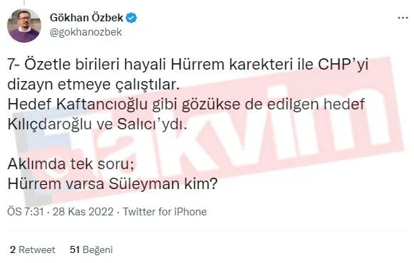 CHP'nin hayali bir karakter olan Hürrem ile dizayn edilmeye çalıştığına dikkat çeken Gökhan Özbek, "Hedef Kaftancıoğlu gibi gözükse de edilgen hedef Kılıçdaroğlu ve Salıcı'ydı. Aklımda tek soru; Hürrem varsa Süleyman kim?" şeklinde konuştu.