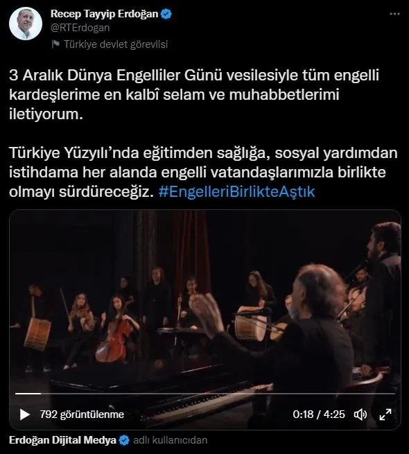 "Engelleri birlikte aştık" etiketiyle yaptığı paylaşımda Erdoğan, "3 Aralık Dünya Engelliler Günü vesilesiyle tüm engelli kardeşlerime en kalbi selam ve muhabbetlerimi iletiyorum. Türkiye Yüzyılı'nda eğitimden sağlığa, sosyal yardımdan istihdama her alanda engelli vatandaşlarımızla birlikte olmayı sürdüreceğiz." ifadelerini kullandı.
