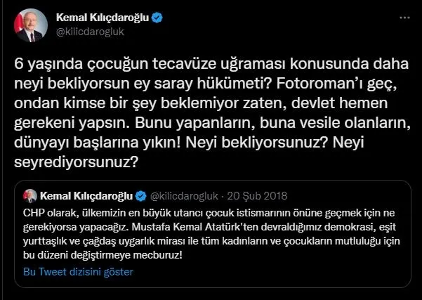 Türkiye'yi sarsan olayla ilgili bu gelişmeler yaşanırken, 6 yaşındaki bir çocuğun yaşadığı cinsel istismar üzerinden siyaset malzemesi çıkarmaya çalışan CHP Genel Başkanı Kemal Kılıçdaroğlu, sosyal medyadan akılalmaz bir paylaşıma imza attı.