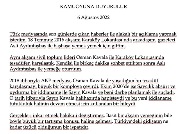 "Türk medyasında son günlerde çıkan haberler ile alakalı bir açıklama yapmak istedim. 18 Temmuz 2016 akşamı Karaköy Lokantası'nda arkadaşım, gazeteci Aslı Aydıntaşbaş ile başbaşa yemek yemek için gittim. Aynı akşam sivil toplum lideri Osman Kavala ile Karaköy Lokantası'nda tesadüfen karşılaştık. Kendisi ile birkaç dakika sohbet ettikten sonra Aslı Aydıntaşbaş ile yemeğe oturdum. 2018 itibarıyla AKP medyası, Osman Kavala ile yaşadığım bu tesadüf karşılaşmayı büyük bir komploya çevirdi. Ekim 2020'de ise savcılık absürt ve uydurma bir iddianame ile Sayın Kavala ve beni darbe planlamak ile suçladı. O tarih itibarıyla Sayın Kavala halihazırda hapisteydi ve bu yine iddianame tutukluluk halinin devam etmesi için kullanılan bir hileydi. Gerçekleri inkar etmek için hakikati değiştirmez. Basit bir akşam yemeğinin bile böyle büyük bir tartışma konusu haline gelmesi, Türkiye'deki gidişatın ne kadar üzücü olduğunun bir ispatıdır."