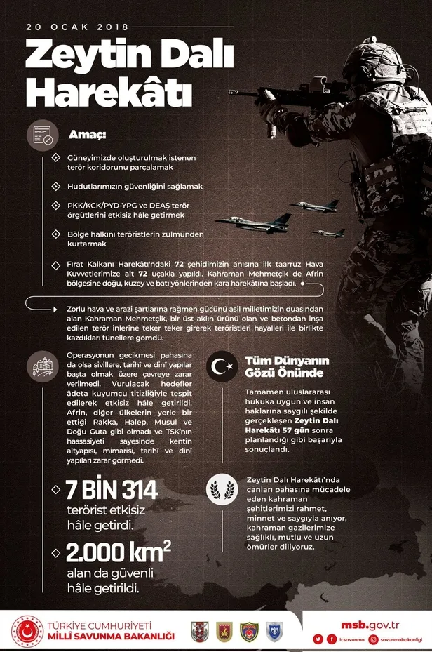 Zeytin Dalı Harekatı'nda 7 bin 314 terörist etkisiz, 2 bin kilometrekare alan da güvenli hale getirildi.