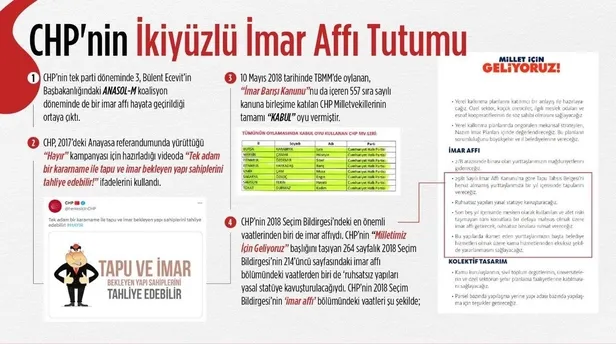 CHP'nin 2017 yılında kurumsal hesabından imar affını savunduğu, imar affını engelleyeceği için Cumhurbaşkanlığı Hükümet Sistemi referandumuna destek vermeyin dediği ortaya çıktı.