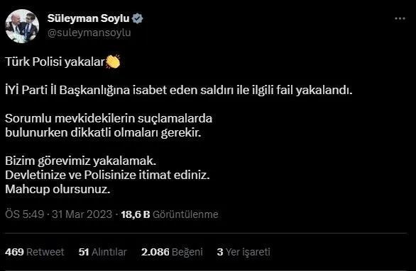İçişleri Bakanı Süleyman Soylu, saldırganın yakalandığını duyurdu. Soylu, "Türk Polisi yakalar. İYİ Parti İl Başkanlığına isabet eden saldırı ile ilgili fail yakalandı. Sorumlu mevkidekilerin suçlamalarda bulunurken dikkatli olmaları gerekir. Bizim görevimiz yakalamak. Devletinize ve Polisinize itimat ediniz. Mahcup olursunuz." ifadelerini kullandı.