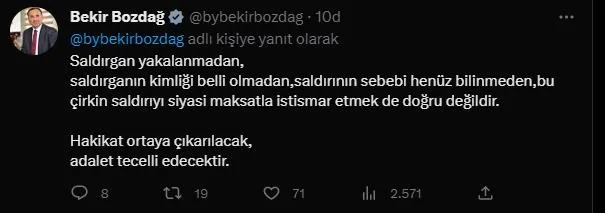 "Saldırı hakkında Bakırköy Cumhuriyet Başsavcılığı tarafından resen soruşturma başlatılmıştır. Saldırı bütün boyutlarıyla aydınlatılacaktır. Saldırgan yakalanmadan, saldırganın kimliği belli olmadan, saldırının sebebi henüz bilinmeden, bu çirkin saldırıyı siyasi maksatla istismar etmek de doğru değildir. Hakikat ortaya çıkarılacak, adalet tecelli edecektir."