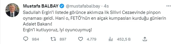 Balbay, "Sadullah Ergin'i listede görünce aklımıza ilk Silivri Cezaevinde pinpon oynaması geldi. Hani o, FETÖ'nün en alçak kumpasları kurduğu günlerin Adalet Bakanı! Ergin'i kutluyoruz, iyi oyuncuymuş!" cümlelerini kurdu.