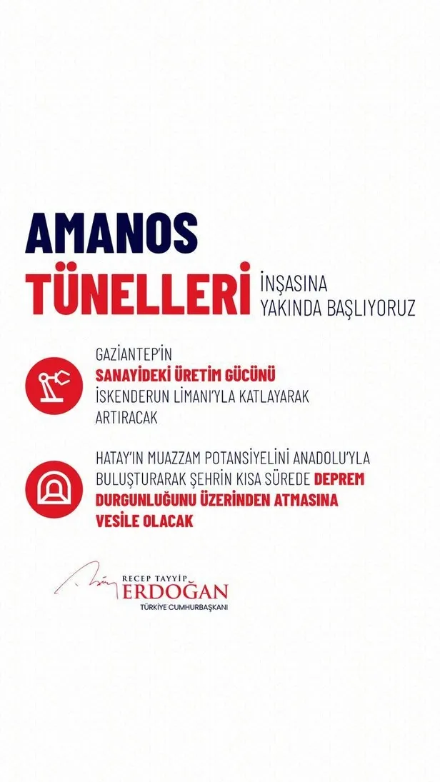 Amanos Tünelleri'nin inşasına başlıyoruz. Tüneller, Gaziantep'in sanayideki üretim gücünü İskenderun Limanı ile katlayarak artıracaktır. Aynı şekilde bu tüneller Hatay'ın muazzam potansiyelini Anadolu ile buluşturarak şehrin kısa sürede deprem durgunluğunu üzerinden atmasına vesile olacaktır.