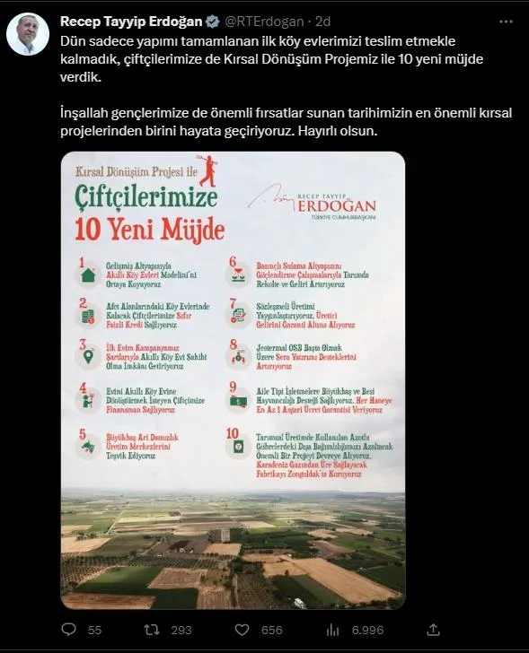 Başkan Erdoğan, "Dün sadece yapımı tamamlanan ilk köy evlerimizi teslim etmekle kalmadık, çiftçilerimize de Kırsal Dönüşüm Projemiz ile 10 yeni müjde verdik. İnşallah gençlerimize de önemli fırsatlar sunan tarihimizin en önemli kırsal projelerinden birini hayata geçiriyoruz. Hayırlı olsun." ifadelerini kullandı.