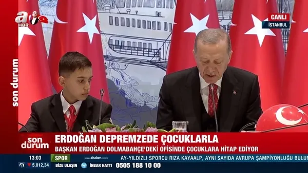 Son dakika haberleri... Başkan Erdoğan depremzede çocuklarla İstanbul'da buluştu. Erdoğan, Dolmabahçe'deki ofisinde çocuklara hitap etti. Erdoğan, "İnşallah 1 yıl içinde şehirlerimizi ayağa kaldırarak depremzedelerimizi normal hayatlarına geri döndüreceğiz" dedi. Erdoğan'ın konuşmasının ardından konuşma sırası depremzede çocuklara geçti. Her biri bir bakan olan çocuklar isteklerini sıraladı. Kameralara renkli görüntüler yansıdı.
