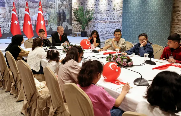 Başkan Recep Tayyip Erdoğan, 23 Nisan Ulusal Egemenlik ve Çocuk Bayramı dolayısıyla Dolmabahçe Çalışma Ofisi'nde, deprem bölgesinden gelerek İstanbul'da eğitim öğretim hayatına devam eden çocukları kabul etti.