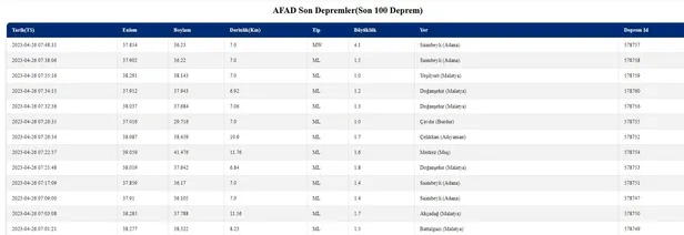 2023-04-26 07:38:06 37.902 36.22 7.0 ML 1.5 Saimbeyli (Adana) 578758
