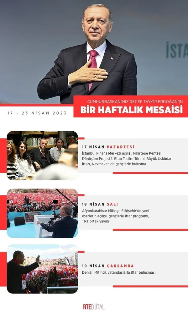 19 Nisan Çarşamba: Denizli mitingi, vatandaşlarla iftar20 Nisan Perşembe: Topkapı Sarayı restorasyonu ile tamamlanan birimlerin açılışı, Karadeniz gazını devreye alma töreni