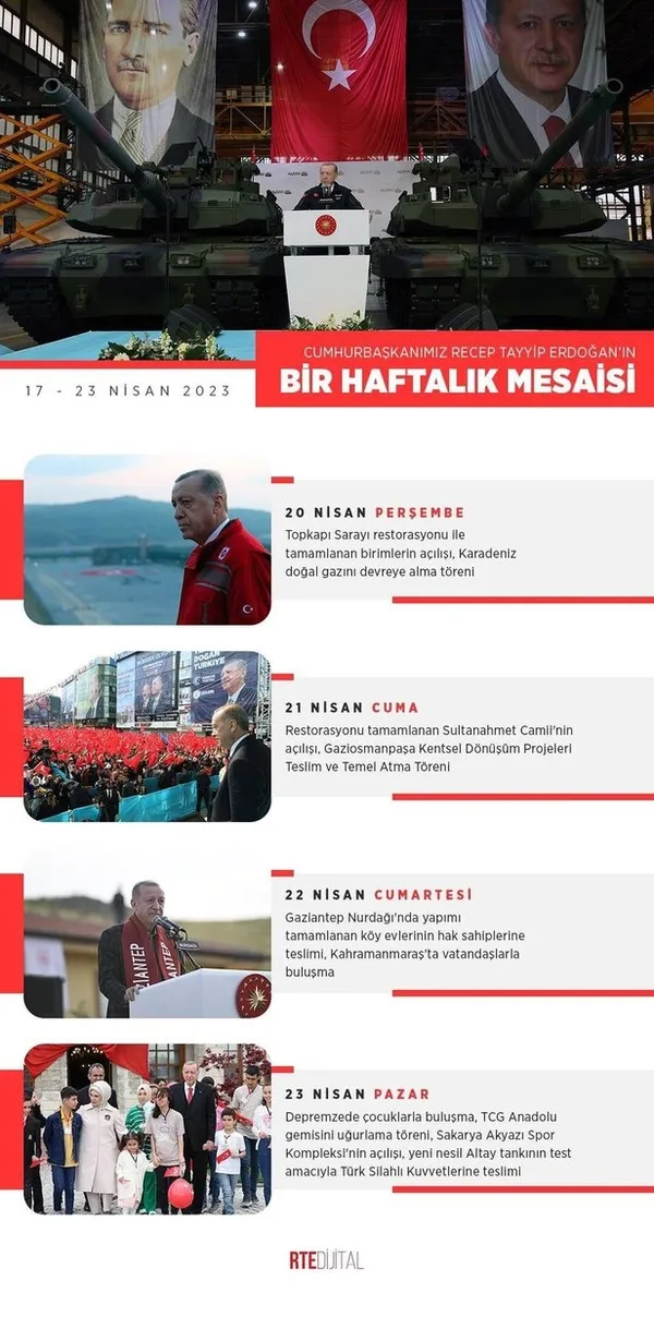 23 Nisan Pazar: Depremzede çocuklarla buluşma, TCG Anadolu gemisini uğurlama töreni, Sakarya Akyazı Spor Kompleksi açılışı, Yeni Altay Tankının TSK'ya teslimi