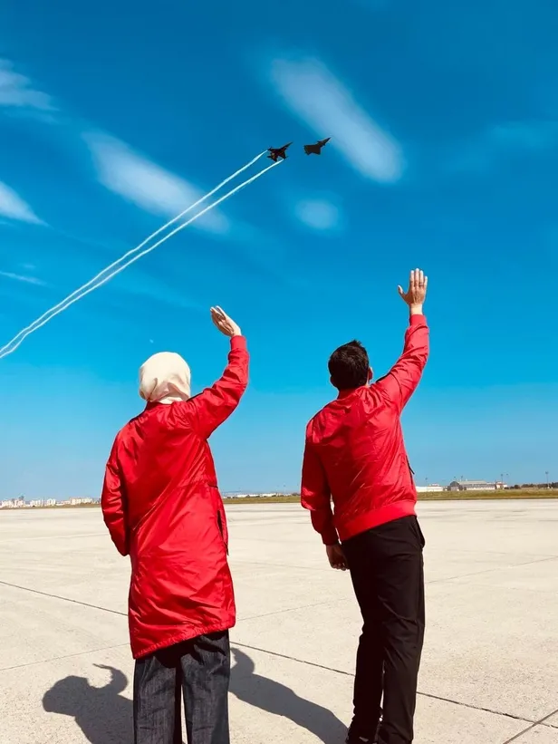 İnsanlı ve insansız savaş uçaklarının tarihi uçuşlarını Baykar Yönetim Kurulu Başkanı Selçuk Bayraktar ve eşi Sümeyye Erdoğan Bayraktar birlikte izledi. Selçuk ve Sümeyye Bayraktar KIZILELMA ve SOLOTÜRK'ün geçişlerini selamladı.