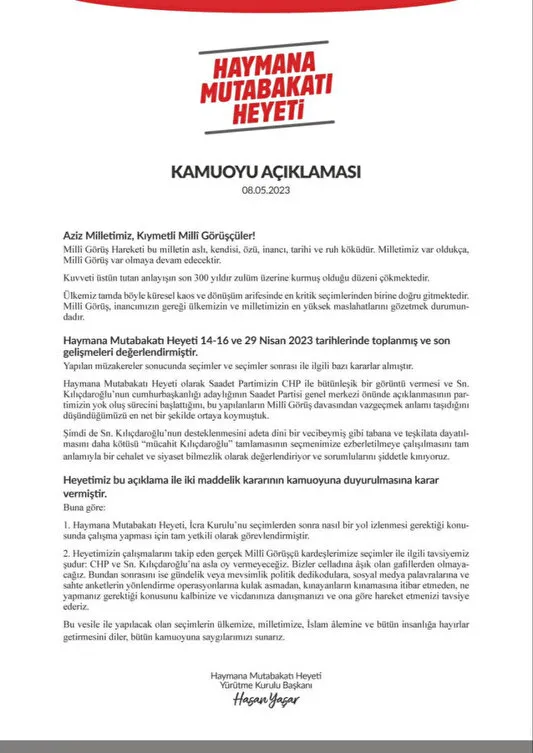 Bildiride "Heyetimizin çalışmalarını takip eden gerçek Milli Görüşçü kardeşlerimize seçimler ile ilgili tavsiyemiz şudur: CHP ve Sn. Kılıçdaroğlu'na asla oy vermeyeceğiz. Bizler celladına âşık olan gafillerden olmayacağız." ifadeleri kullanıldı