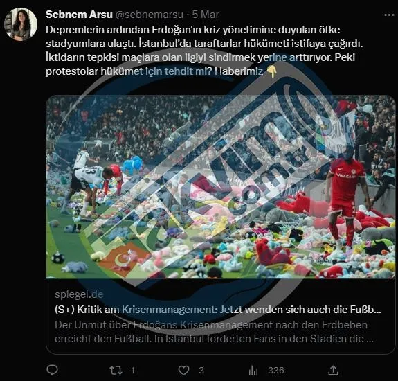 Haberlerini Başkan Erdoğan düşmanlığı üzerinden oluşturan ve Der Spiegel'in sözcülüğünü yapan Arsu'nun depremden başlayan lig maçlarından birkaçında yaşanan provokasyonları, "Depremlerin ardından Erdoğan'ın kriz yönetimine duyulan öfke stadyumlara ulaştı. İstanbul'da taraftarlar hükümeti istifaya çağırdı. İktidarın tepkisi maçlara olan ilgiyi sindirmek yerine arttırıyor. Peki protestolar hükümet için tehdit mi?" şeklinde servis ettiği ortaya çıktı.