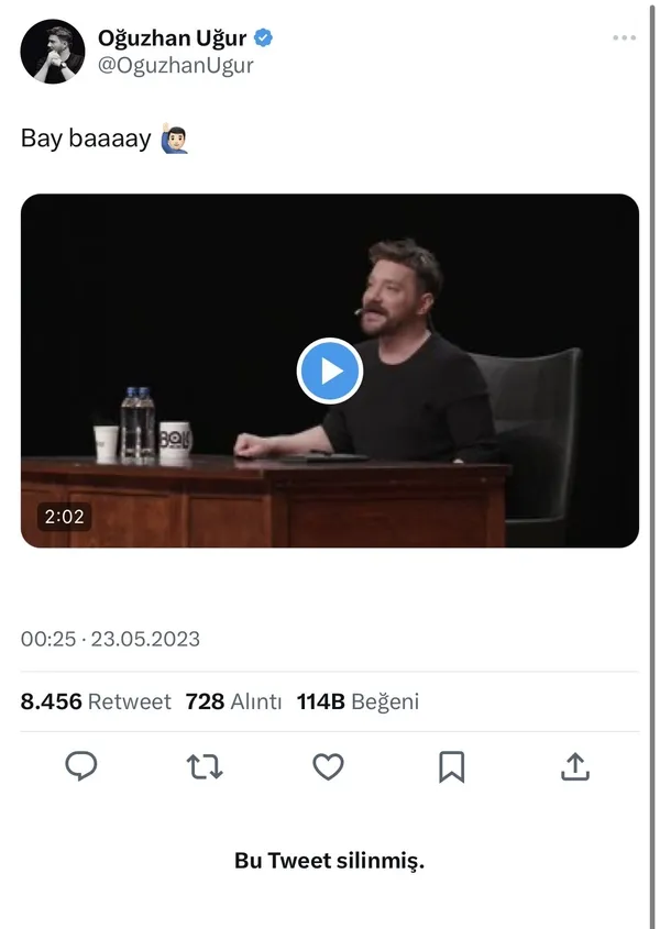 Öte yandan Kılıçdaroğlu'yla tiyatrosu ortaya çıkan Oğuzhan Uğur'un Yuşa Övenç'i "Bay Bay" diyerek paylaştığı video ile hedef gösterdiği ve sonrasında sildiği de ortaya çıktı.