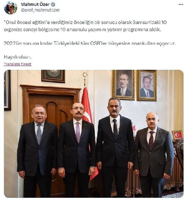 Milli Eğitim Bakanı Mahmut Özer, 2023'ün sonuna kadar Türkiye’deki tüm OSB’lere anaokulları açacaklarını söyledi. Ticaret Bakanı Mehmet Muş ile Milli Eğitim Bakanı Mahmut Özer, Samsun Büyükşehir Belediyesini ziyaret ederek Başkan Mustafa Demir ile görüştü. Başkan Demir, bakanlara belediyelerin yürüttüğü projeleri anlattı.