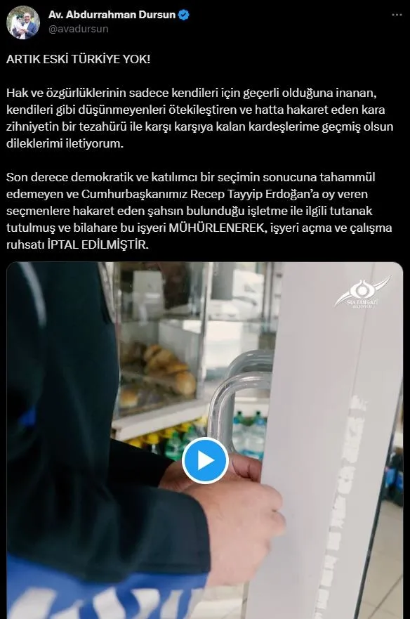 Son derece demokratik ve katılımcı bir seçimin sonucuna tahammül edemeyen ve Cumhurbaşkanımız Recep Tayyip Erdoğan'a oy veren seçmenlere hakaret eden şahsın bulunduğu işletme ile ilgili tutanak tutulmuş ve bilahare bu işyeri MÜHÜRLENEREK, işyeri açma ve çalışma ruhsatı İPTAL EDİLMİŞTİR." ifadelerini kullandı.