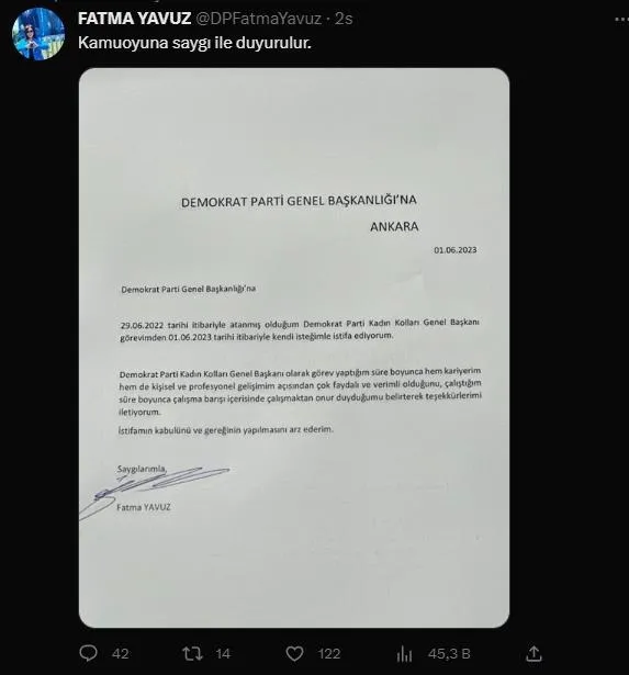 Siyaset büyüklerimize örnek olması umuduyla 'Yeter söz milletindir' diyerek yola çıktığım ve 6 Ekim 2022 tarihinde başladığım Demokrat Parti Kadın Kolları Genel Başkan Yardımcılığı ve Parti Sözcülüğü görevimden istifa ediyorum."