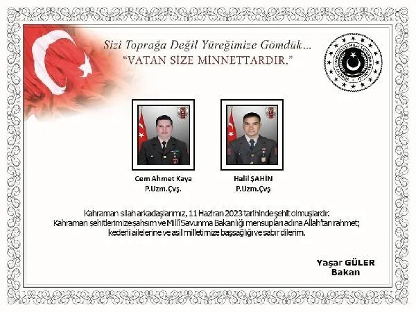 Bakan Güler, "Kahraman silah arkadaşlarımız, 11 Haziran 2023 tarihinde şehit olmuşlardır. Kahraman şehitlerimize şahsım ve Milli Savunma Bakanlığı mensupları adına Allah'tan rahmet; kederli ailelerine ve asil milletimize başsağlığı ve sabır dilerim" dedi.