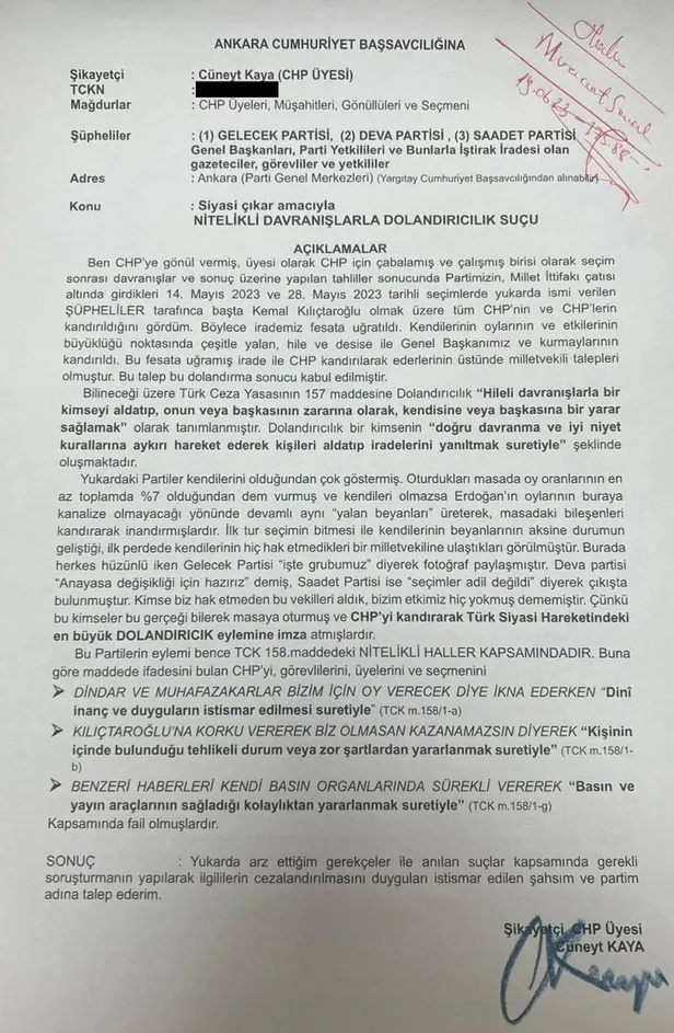 Yaşanan bu gelişmeler tüm sıcaklığını korurken CHP üyesi Cüneyt Kaya, Ankara Cumhuriyet Başsavcılığı'nda Gelecek, DEVA ve Saadet Partisi'ne 'dolandırıcılık' davası açtı.