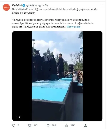 İlahiyat fakültesindeki başörtülü öğrencilerin mezuniyetini 'Hukuk fakültesi mezuniyet töreni' diyerek çarpıtan ve başörtüsünü hedef alan şahıs başörtülü öğrencileri aşağılayıp şu ifadeleri kullandı: "İstanbul hukuk fakültesinde geleceğin hukukçuları harika! Geleceğin hukukçuları müthiş bir şey. Adalet bu güzel insanlara emanet olacak. Nasıl hukuk fakültesi, valla bravo, mezun olmuşlar. Burası da 'Ey Türk gençliği! Birinci vazifen; Türk istiklalini, Türk cumhuriyetini, ilelebet muhafaza ve müdafaa etmektir' Valla bravo."